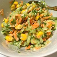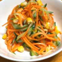 にんじんときゅうりのコールスロー風のご紹介です。にんじんときゅうりの歯応えとコーンの甘味が、酸味の効いたマヨネーズソースとよく合います。副菜の一品や、パンにはさんでサンドイッチにしても便利ですよ。ぜひお試しくださいね。