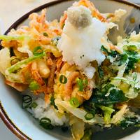 桜海老、三つ葉、玉ねぎ、枝豆、大豆煮などかき揚げにしました。ご飯の上に、大根おろしとおろし生姜を乗せ、先にお醤油で少しかき揚げを食べ、その後にお出汁をかけて食べました。簡単なのに、家族が喜ぶ豪華な食卓になりました。