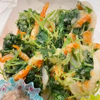 生の桜エビ(冷凍)で作りました。新玉ねぎも入れました。かき揚げは揚げるの難しいですね〰衣が少なかったから?