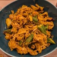 エリンギを追加して、とても美味しいキムチ炒めが完成しました。ケチャップを隠し味に入れるとは、流石野永シェフ!