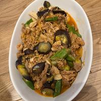 - 5 3の豚バラ肉とナスに火が通ったら4を加え、ラー油を回し入れて中火で炒め合わせます。