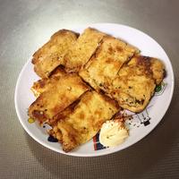 - 4 フライパンを熱し、片面を軽く焼いたら、爪楊枝を取り、もう片面を軽く焼きます。
