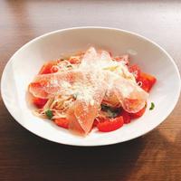 - 4 お皿に盛り付け、生ハムを手でちぎってのせ、粉チーズをかけて完成です。