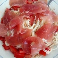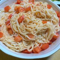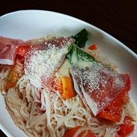 そうめんをイタリア風トマトソースでオシャレに仕上げました。カッペリーニのように細いそうめんはソースの絡みがよく、さっぱりとした味付けでも満足感のある一品です。そうめんをスパゲティにしても美味しくお召し上がりいただけます。