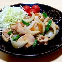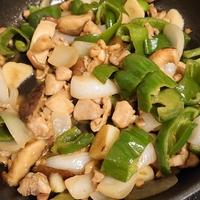 先にピーマンと玉ねぎを油で炒めて一度取り出し、その後ごま油を入れて鶏肉焼いた。