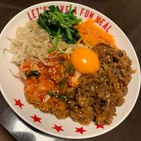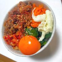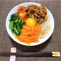 具材たっぷり、ビビンバ風まぜそばのご紹介です。ビビンバのようにナムル、焼肉のタレで味付けした牛バラ肉、キムチなどを混ぜていただく、まぜそばです。具材がたっぷり乗っているので満足感のある一品ですよ。ぜひお試しくださいね。