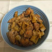 他の方のを真似して人参を加え、余っていた鳥もも肉で作りました。動画と違い、煮汁が沢山残ってしまいましたが、味が染みていて美味しくできました。
