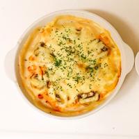 - 4 耐熱皿に1を入れ、ホワイトソース、2、3、ピザ用チーズをかけ、200℃に予熱したオーブンで15分程焼き色がつくまで焼きます。