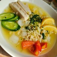 - 3 お皿に添付のスープ、冷水、ナンプラー、レモン汁を入れしっかりと混ぜ合わせ2を盛り付けます。