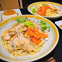 ハーブのサラダチキンと、トマトの代わりにサーモンを使ってアレンジしてみました。夏場に冷やし中華に飽きた時にいいレシピだと思います。