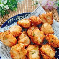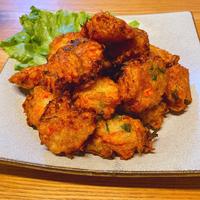 - 6 フライパンの底から3cm程の揚げ油を注ぎ、180℃に熱し、5を入れます。5分程揚げ、中まで火が通り、色づいたら油を切ります。