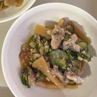 - 2 ボウルに(A)を入れて混ぜ、水気を切った1とサバの水煮缶とメンマを加えて、サバをほぐしながら、全体に味が馴染むように和えます。