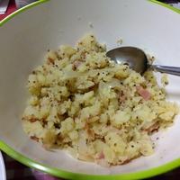 - 1 じゃがいもは8等分に切り、耐熱ボウルに入れてラップをかけ、600Wの電子レンジで4分加熱し、柔らかくなったら熱いうちにフォークで潰します。