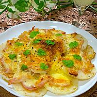 ベーコンと長芋をフライパンで炒めてから、耐熱皿に移し替えて、調味料とチーズとパン粉を乗せてトースターで5分程焼きました。
