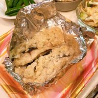 - 5 4の表面に3を塗ってホイルで包み、上側と両端を閉じてオーブントースターで15分ほど焼いたら完成です。皿に盛り付け、お好みで青ねぎを添えてください。