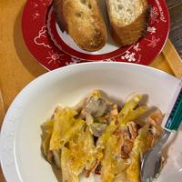 お使いのトースター機種によって焼き加減が異なりますので、様子を見ながらご調整ください。今回は1000W220℃で焼いています。トースターは庫内が狭く、食材と熱源の距離が近いため、加熱中の食材の油が落ちたり、油はねなどが原因で発煙、発火の恐れがあります。加熱中は目を離さないでください。 塩こしょうの量は、お好みで調整してください。 マカロニの加熱時間はパッケージに記載されている時間を目安にしてください。 牛乳は、加熱しすぎると分離する可能性がありますので、火加減にご注意ください。 今回は400ml耐熱皿を使用しました。