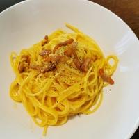 自家製パンチェッタを食べるために作りました。ちょっと卵が固まってしまいましたが、味は美味しかったです。