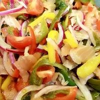 パプリカを少し厚めに切ってオリーブオイルで炒めてから調味料を入れて冷蔵庫で冷やし冷えたら他の具材も入れて更に馴染ませました😊