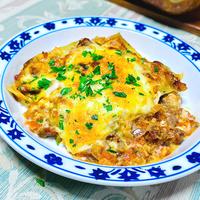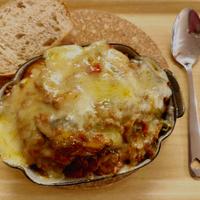 - 6 耐熱皿に5、3の順に交互に重ね、最後に残りの5をかけ、ピザ用チーズをのせます。焼き色がつき、温まるまでオーブントースターで10分程焼きます。
