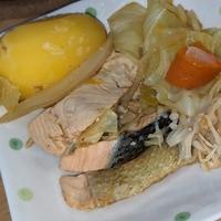 鮭、カブ、キャベツ、じゃがいも、玉葱、人参、椎茸、えのき、甘酒と味噌とあご出汁でいいお味の鍋🤗