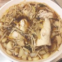 - 5 土鍋にスープの材料を入れます。ひと煮立ちしたら1、2、3、を入れ蓋をし、中火にかけます。