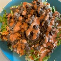 目玉焼きを乗せたせいか味が薄かったのでソースはたっぷりかけた方がいいと思いました。