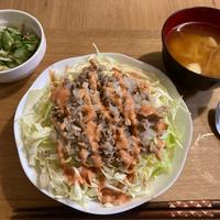 キャベツの千切りはもっと細く切ったほうが良かった。スライサーを使うか、ちょっとレンチンして柔らかくしてから千切りすれば良かったかも