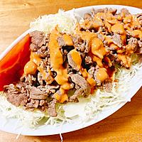 がっつり食べたいビーフケバブ風ライスのご紹介です。にんにくの効いたあつあつのビーフを、ピリ辛のソースと一緒にお召し上がりください。今回はごはんに乗せていますが、お好みでパンやトルティーヤに挟んでも美味しいですよ。
