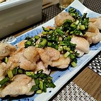 食べレポ参考に鶏肉は塩と酒で揉み込んでおくのと、焼いたあと塩コショウを少し振りました。ニラだれは電子レンジで少しだけ加熱。好みですが砂糖、酢は少なめ味を見て鶏ガラと醤油とごま油を足しました。
