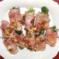 ベーコンの上にとろけるチーズを敷き菜の花を巻きました。焼く時に崩れすのを心配して楊枝を刺したりしましたが動かさずに焼くと刺してなくても崩れませんでした。簡単で美味しいです♪