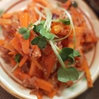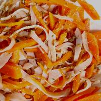 かつお節の風味をしっかりと効かせて、にんじんを土佐和え風に仕立てました。土佐和えは、かつお節の旨味やごまの風味を活かした、素朴でありながら味わい深い料理です。にんじんの甘みとよく合いますので、ぜひお試しくださいね。