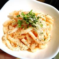 明太マヨネーズとうどんを和えるだけの簡単レシピです。しっかり目の味付けなので、お酒のおつまみにも最適です。レタスやベビーリーフと一緒に盛り付けて、サラダうどんにするのもおすすめです。疲れて帰った夜ごはんに、パッと作れて便利です。