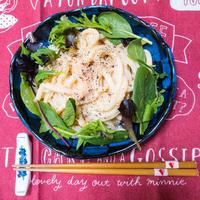 冷凍讃岐うどんを電子レンジでチンして、明太マヨネーズと和えるだけで簡単に作れました。ベビーリーフをのせてサラダうどん風になりました。