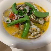 - 5 煮汁をカレイにかけながら強火で煮込み、煮汁が少なくなったら水を足して調整します。カレイに火が通りアサリの殻が開いたら3を加えます。