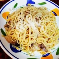 うまーい✨椎茸とエリンギで作りました。固形のパルミジャーノたっぷりかけました。塩味だけなんですよね。こってりもさっぱりもし過ぎずちょうど良い味付け〜