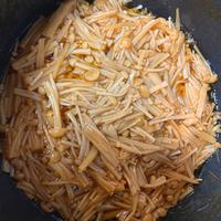 簡単でおいしかったので2回目。えのきを三等分すると短くて食べにくかったので今回は二等分に切って作ったのと、前回ちょっと甘めに感じたので鷹の爪を入れてみました。