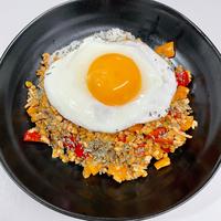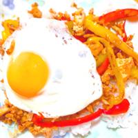 - 6 皿にご飯を盛って炒めた具材をのせ、上に目玉焼きをのせたら完成です