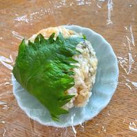 - 3 ラップに半量ずつのせて包み、三角形に握ります。ラップを外し、大葉を敷いたお皿に盛り付けて完成です。