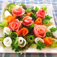 - 5 生ハムでバラを作ります。 生ハムを2枚横に並べ、真ん中より少しはみ出すくらいの位置で2つに折ります。 巻き始めを少し強めに、巻き終わりにかけてやさしく巻きます。