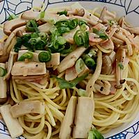 - 準備 ニンニクはみじん切りにしておきます。エリンギは薄切りにしておきます。しめじは石づきを取ってほぐしておきます。薄切りハーフベーコンは5mm幅に切っておきます。 沸騰したお湯に塩小さじ2を入れ、スパゲティをパッケージの表記に従ってゆで、ゆで汁を30ml取り、湯を切っておきます。