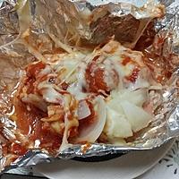 - 4 アルミホイルを広げ、オリーブオイルをはけで塗り、1、3を交互に並べ、(A)、ピザ用チーズをのせて包みます。同様にもう1つ作ります。