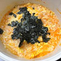 冷凍ご飯150・キムチ100(汁入り)・玉子2・水280・(A)はそのまま。ご飯が150だったから少し分量を変えてアレンジ、玉子を入れてからなかなか固まらず30秒ずつ時間を増やした。途中味変でジャバン海苔追加、美味しい。キムチ多めにして正解だったけど次はもう少し水を減らそう✏️