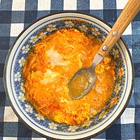 - 4 取り出して2を回し入れて軽く混ぜ合わせ、再びラップをし600Wの電子レンジで1分程、卵が半熟状になるまで加熱します。