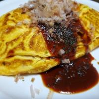 食べ易いように、そば1玉を8等分に切り、安くなっていた『焼きそば用』のカット野菜を全てみじん切り。最後にかけるソース作りもやってみました。ウスターソース大さじ①/ケチャップ大さじ①/黒胡椒で味を〆めてと!豚バラ肉を炒める際の隠し味にガーリックを振りかけ、その後に『みじん切りにした野菜』が少しシンナリしたころに、焼きそばを投入!予め付いていた粉ソースを散りばめ、おでんの素を小さじ1杯。〆にお好み焼きソースと塩コショウで味を整え、焼きそばが色付いた頃に、紅生姜もイン!卵は2個と卵黄1個に、塩コショウ少々に加え、卵をフワフワにさせる為にマヨネーズ少量を加え入れて掻き混ぜ、サラダ油を熱したフライパンに投入!半熟よりやや硬めに卵を焼き、火を止めてから、その上に、焼きそば達を横に一列に並べ、オムライスな感じで、焼きそばを包んでみました!最後に、最初に作っておいたソースを火にかけ、トロミがでるまで撫でる感じで掻き混ぜ、温まったソースを卵の上から垂らし、アオサと鰹節でトッピング!