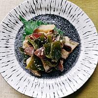 - 3 ナスがしんなりとして火が通ってきたら、生わかめと調味料を加え、味が馴染むまで炒めます。