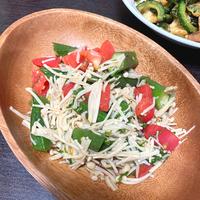 - 3 耐熱ボウルに1、2を入れて、ふんわりとラップをかけ、えのきに火が通るまで600Wの電子レンジで2分程加熱します。粗熱を取り、水気を切ります。