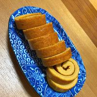 - 4 温かい内に巻きすの上に置きクッキングシートをはがし、2cm間隔で浅く切り込みを入れ巻きます。両端を輪ゴムで留め、縦置きにして30分程、粗熱がとれ形が整うまでおきます。
