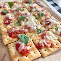 クラッカーを並べて生地にしたピザです。 おやつや、お酒のおつまみに、またパーティーのフィンガーフードにいかがでしょうか! このトマトソースはしっかりと濃厚な味付けで、パスタソースや肉料理になどにも応用できますよ。
