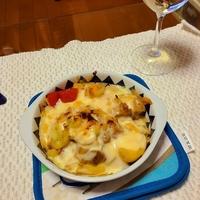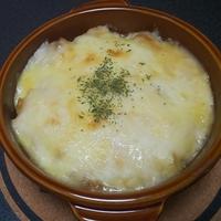 - 5 耐熱皿に4、ホワイトソース、ピザ用チーズを順にのせてトースターで10分~15程加熱しピザ用チーズが溶けてたら取り出します。