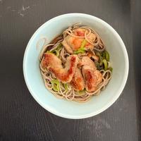 - 4 鍋にお湯を沸かし、そばをパッケージの表記通りに茹でてお湯を切ります。流水で洗い、水気を切ります。